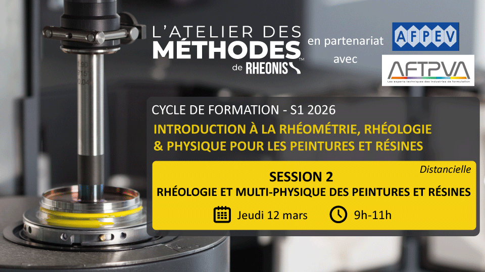 Introduction à la rhéologie pour les peintures et revêtements Mardi 12 mars 2024 9h-12h (3h) Distanciel 300 €HT/part. ObjectifsLors de cette formation distancielle de 3h organisée en partenariat avec l'AFPEV et l'AFTPVA, les participants s'initieront aux principaux concepts de rhéologie en lien avec les propriétés d'application des peintures (liquides) et autres revêtements.NiveauInitiationPublic visé & Pré-requisTout...Webinaires 2023 – « La R&D Comportementale sur rhéomètre »