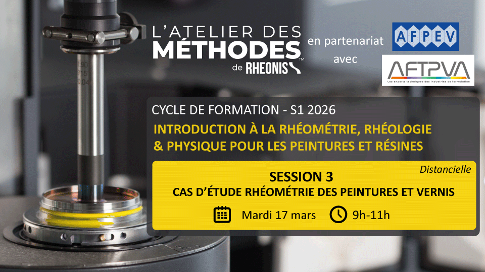 Session 1 : Introduction à la rhéométrie et ses modes d'utilisation pour les peintures et résines Découvrir ou approfondir sa compréhension des rhéomètres et de leurs utilisations possibles pour les peintures et les résines Mardi 10 mars 2026 2h Distanciel 200 €HT/part. OBJECTIFS Découvrir les principes techniques et scientifiques de fonctionnement des rhéomètres Comprendre leurs...